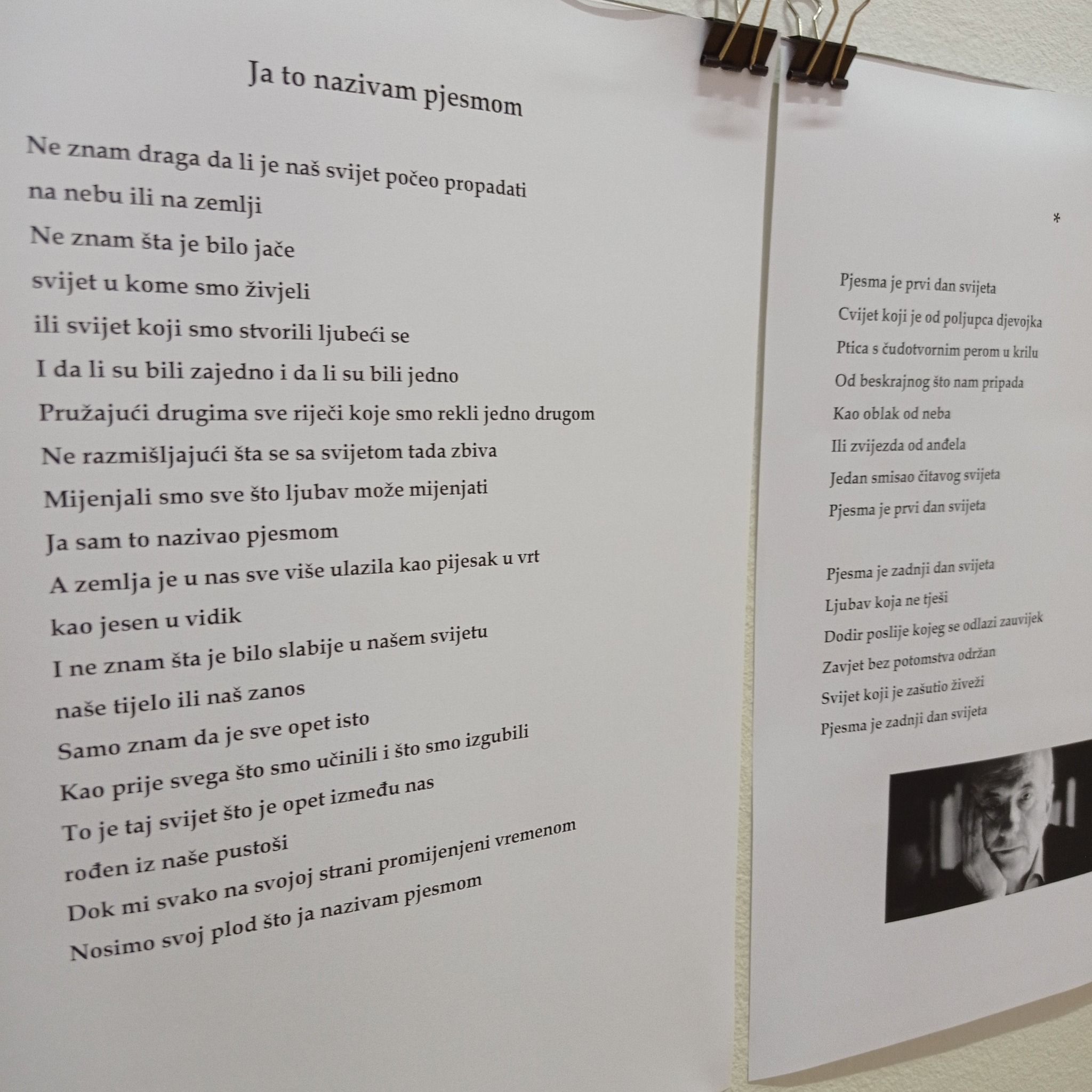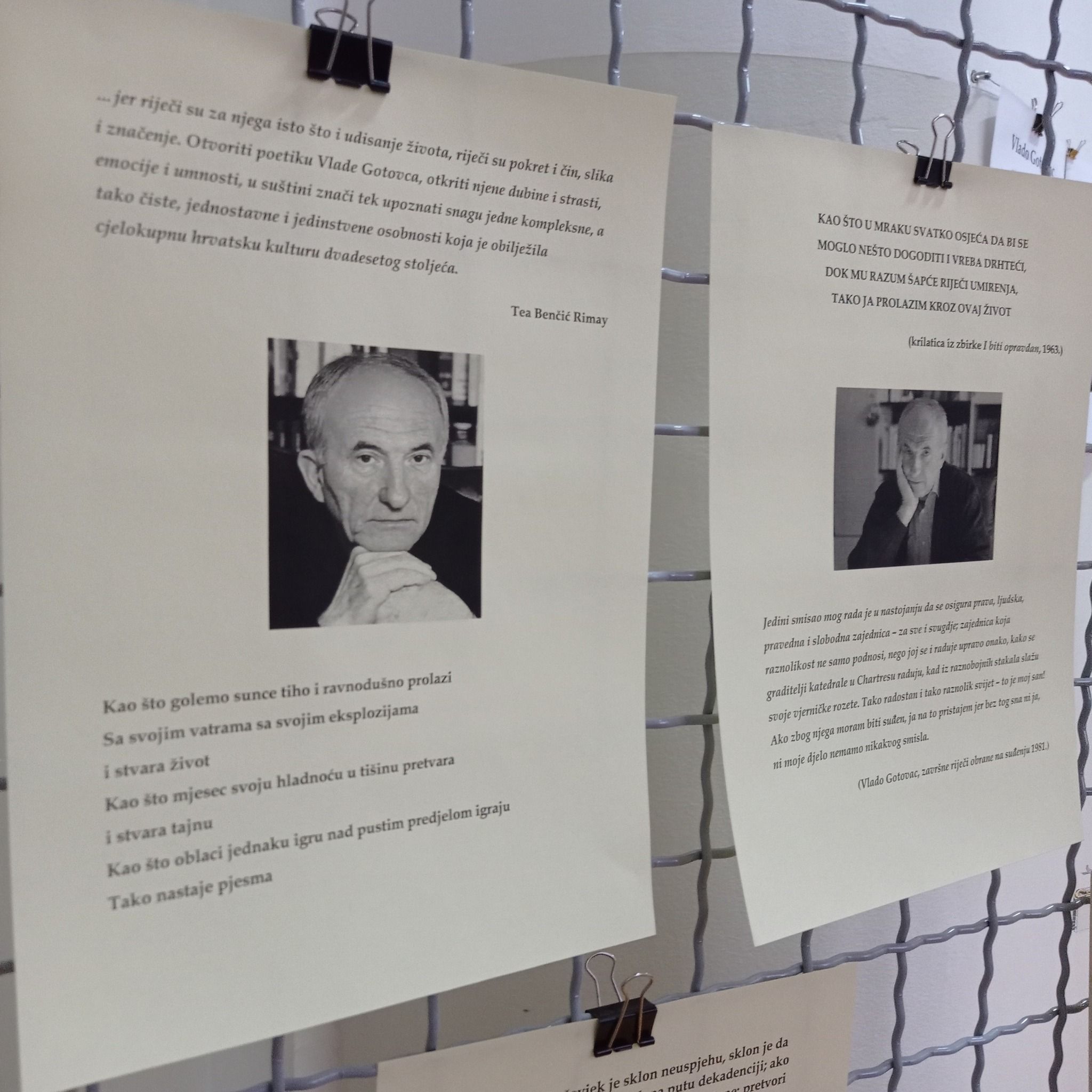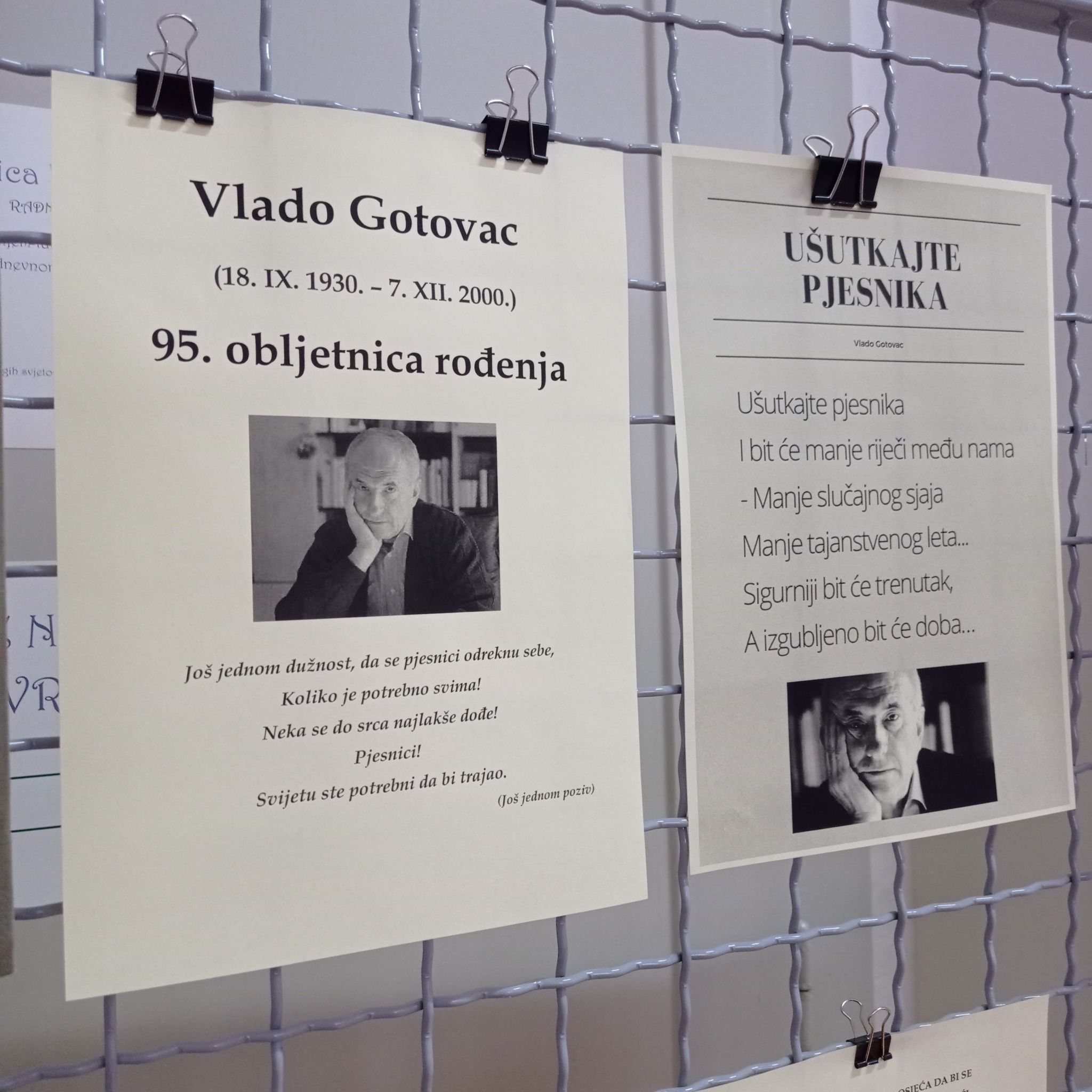 Povodom 95. obljetnice rođenja Vlade Gotovca, istaknutoga hrvatskog književnika, publicista i političara, „proroka u gluhim godinama“, priredili smo 18. rujna malu izložbu tekstova i knjiga. O životu i radu te njegove stihove i tekstove slušali su učenici 1.e i 3.b. Čitajmo Vladu Gotovca jer, kako je napisao u svom pozivu, pjesnici su svijetu „potrebni da bi trajao.“